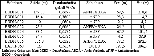 Vancouver, 13. Mai 2008: Petaquilla Copper Ltd. (TSX: PTC, WKN: A0LC6U, "das Unternehmen ") verkündigt die Resultate seiner Bohrungen auf dem Gebiet des El Real Korridors auf dem Petaquilla Kupferprojekt in Panama. Die Ressourcen aus diesem Gebiet waren nicht in den Schätzungen von Mitte der 1990er Jahre enthalten, die vor Gültigkeit der NI 43-101-Berechnungen durch Fluor Daniel und AMEC (vormals: H.A. Simons) für die drei Kupfer-Lagerstätten Petaquilla, Valle Grande und Botija (alle drei liegen nordwestlich des Gebietes El Real Korridor) erstellt wurden. Diese neuen El Real Korridor Ressourcen stellen eine Erhöhung von etwa 15% bei den gemessenen und angezeigten Ressourcen gegenüber der Abgrenzungsstudie von Fluor Daniel und von 23% gegenüber den Werten aus der Durchführbarkeitsstudie von H.A. Simons dar.Die Höhepunkte schließen auch die errechneten Ressourcen im Gebiet Brazo und die neulich definierten Mineralisierungen um die Bohrlöcher BADH-07-353, -373 und -383 etwa 1,5 Kilometer südöstlich der Botija Kupfer-Lagerstätte ein. Beide, also Brazo und die neue Zone, enthalten senkrecht umfangreiche Mineralisierung, darunter: