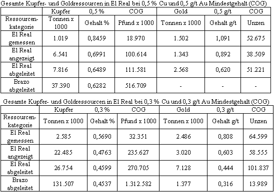 Der Leser sollte darauf hingewiesen werden, dass die ausgewiesenen Mengen und Grade eher konzeptioneller Natur sind und nur geeignet sind, die möglichen Kupfergrade der Ressourcen im El Real Gebiet und in der Brazos Lagerstätte schätzen zu können. Es ist hinzuzufügen, dass die kommerzielle Durchführbarkeit des Kupferabbaus, die metallurgischen Charakteristika und die Verarbeitungskosten zur gegenwärtigen Zeit nicht bekannt sind.