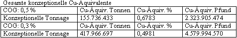 Konzeptionsdaten für Kupfer-Äquivalente wurden errechnet und als Mittel zur Festlegung vernünftiger Brutto-Werte im Boden verwendet, jedoch ohne Berücksichtigung von Abbau- und Bearbeitungskosten.