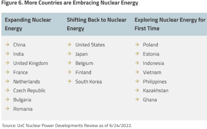 Drei Mega-Trends für den Uran-Bullenmarkt! Der Bullenmarkt für Uran speist sich aus drei vorherrschenden Trends: Dekarbonisierung, Energiesicherheit und Elektrifizierung. Die BRICS-Staaten (Brasilien, Russland, Indien, China und Südafrika), bauen neue Kernkraftwerke so schnell sie können. Länder, einschließlich Japan und Südkorea, die ursprünglich aus Kernkraft aussteigen wollten, haben eine 180-Grad-Kehrtwende vollzogen. Tokio hat beschlossen, sämtliche nach Fukushima stillgelegte Reaktoren neu zu starten, die Laufzeiten für bestehende Reaktoren zu verlängern und zusätzlich neue Reaktoren zu bauen.