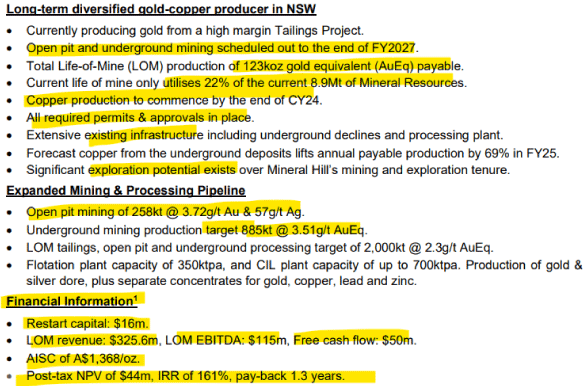 Der Re-Start soll 16 Millionen AUD kosten und daraus soll ein Umsatz von 325 Millionen und ein EBITDA von 115 Millionen AUD erzielt werden. Die AISC je Unze Gold sollen bei 1.368 AUD liegen, was sehr gut wäre, wenn das umgesetzt werden kann.