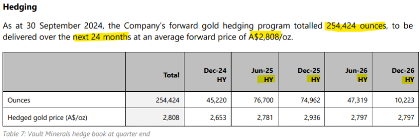 Die Jahresprognose von 390.000 – 430.000 Unzen zu AISC von 2.250 – 2.450 AUD wurde bestätigt. Der relativ niedrige durchschnittliche Verkaufspreis resultiert aus den bestehenden Vorwärtsverkäufen. Diese belasten das Ergebnis. In den nächsten 24 Monaten muss VAULT noch 254.424 Unzen zu durchschnittlich 2.808 AUD (1.853 USD) liefern.