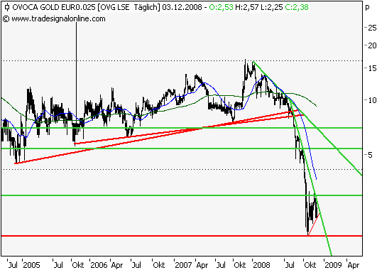 Das Explorationsunternehmen Ovoca Gold Plc. mit Sitz in Irland kann sich natürlich dem allgemeinen Rohstoffabverkaufstrend nicht entziehen und notiert daher nahe - wie kann es anderes sein - des jüngst markierten Allzeittiefs. Seit Mitte August und unter anderem bedingt durch den Bruch gleich zweier Trendlinien beschleunigte sich der begonnene Abwärtstrend zusehends und führte die Aktie innerhalb von nur drei Monaten von etwa 8,15 Pfund bis an ihr erst kürzlich markiertes Allzeittief bei 1,78 Pfund. Vom durchschnittlichen Hoch ausgehend verlor die Aktie bisher gar knapp 90% an Wert und so langsam scheint die Aktie bzw. entsprechende Investoren genug von den Abschlägen zu haben und entsprechend bildet die Aktie derzeit ein äußerst interessantes Chartcluster mit der Tendenz einer nahenden Entscheidung.