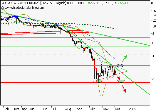 Die Aktie ist unter anderem bedingt durch die kräftigen Abschläge weiterhin ganz klar ein “heißes Eisen“ und keineswegs für Anleger mit schwachen Nerven geeignet. Denn ob die Aktie tatsächlich ihr Tief gesehen hat, muss sich erst noch zeigen. Doch wie bereits Eingangs erwähnt liefert die Aktie aktuell ein interessantes Chartcluster. Gelingt es Ovoca Gold daher sich oberhalb von 2,65 zu etablieren, so sollte ein Angriff auf das Widerstandslevel um 3 Pfund in Kürze anstehen. Ein Ausbruch über dieses Kursniveau sollte der Aktie einen starken Aufwärtsschub bescheren können. Hingegen mit einem Bruch der kurzfristigen Aufwärtstrendlinie und Kursen unterhalb von 2,20 Pfund ein Rückschlag bis mindestens zu den Allzeittiefsständen nicht zu vermeiden wäre.
