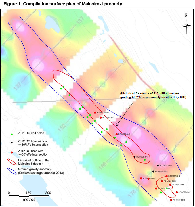 The Malcolm-1 area lies approximately 3 kilometres northwest from the Houston orebodies. Initial work on this property was carried out by LIM in 2011 and returned ore-type intersections in 14 of 18 holes drilled (see press release dated May 31, 2012). In 2012, RC drilling on the Malcolm-1 property consisted of 14 holes totalling 1,600 m and 11 of the 14 holes returned ore-type intersections. Figure 1 outlines the hole locations from the 2011 and 2012 drill programs, as well as the historical resource previously identified by the Iron Ore Company of Canada ("IOC"). The historical (non NI 43-101 compliant) mineral resource is 2.9 million tonnes grading 56.2@ Fe. A manganese resource was also identified by IOC, totalling 422,000 tonnes at a grade of 51.4% Fe. LIM expects to report a new NI 43-101 compliant mineral resource for the Malcolm-1 deposit by the end of its fiscal year.