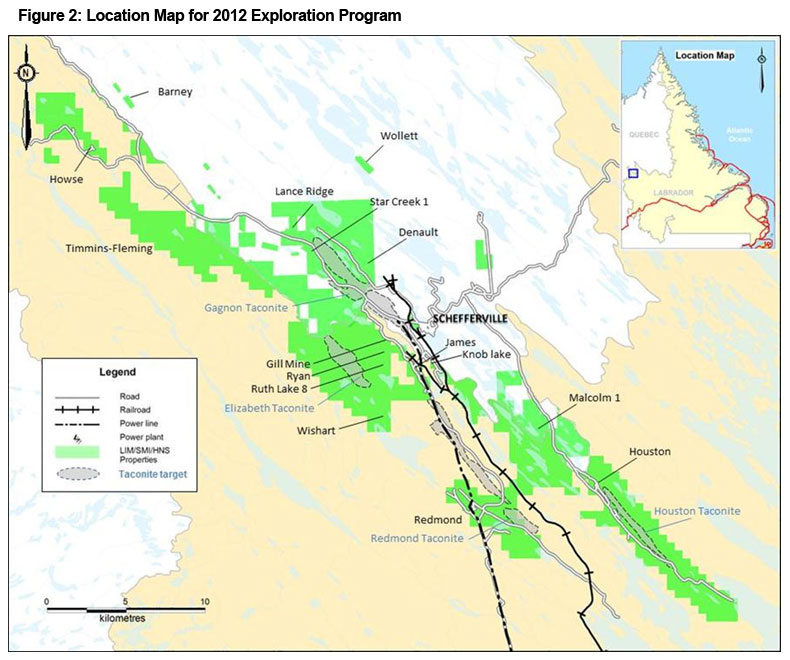 LIM is anticipating new mineral resource estimations on the James Deposit (including the James South Extension), Malcolm-1, Houston 1, 2 and 3 and on the historic crushed ore stockpiles. An initial mineral resource estimation will also be provided on the Elizabeth Lake Taconite. Refer to Figure 2 and Table 2 in the appendix for the location of these properties and total metres drilled in 2012.