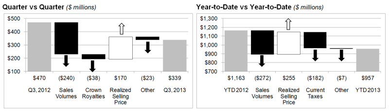 Cash flow from operations decreased to $339 million, or $0.70 per Share, in the third quarter of 2013 from $470 million, or $0.97 per Share, in the third quarter of 2012 primarily due to lower sales volumes and higher Crown royalties, partially offset by a higher realized selling price. On a year-to-date basis, cash flow from operations decreased to $957 million, or $1.97 per Share, in 2013 from $1,163 million, or $2.40 per Share, in 2012 reflecting higher current taxes, with lower sales volumes largely offsetting a higher realized selling price in 2013.