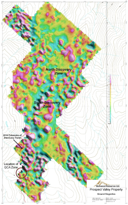 The majority of historical drilling on the Prospect Valley property has taken place in the centre of the claim block, along the Discovery Trend. This drilling outlined an extensive low grade epithermal gold system with indications of potential for additional and higher grade mineralization, and it remains open for expansion (see Berkwood news release dated January 25, 2012 for details). Results of the recent ground magnetics geophysical survey suggest that the Discovery Trend continues a further 1200m to the south of the previous work into an area that is largely hidden by overburden cover. The geophysical program consisted of 21 lines varying in lengths of 700 meters to 900 meters and was surveyed with readings taken along the lines at 12.5 meter stations.