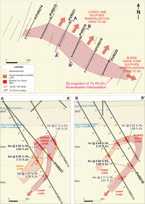 The top of the sulphide mineralization in the Burke Hinge Zone is present at depths below surface of between 24 m to 40 m, and has a known plunge extent of 200 m. The Burke Hinge Zone is open to the SE and the Lower Limb is open down dip to the NE. The location of the drilling and geometry of the mineralization is shown in plan and in cross sections in Figure 1.