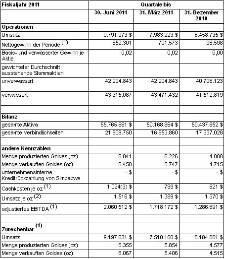 Quartalsumsätze und Goldproduktion erreichen Rekorde Nettogewinn von 0,02 $ je Aktie in dem am 30. Juni 2011 geendeten Quartal, verglichen mit einem Nettoverlust von 0,00 $ je Aktie in dem am 30. Juni 2010 geendeten Quartal