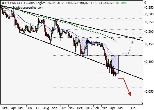 Der kanadische Explorer Legend Gold zeigt sich, ähnlich wie zahlreiche andere Minen auch, seit Monaten von seiner schwachen Seite und lotet unermüdlich Kurstiefs aus. Der Trend weist noch immer eine klare Abwärtstendenz auf und solange keine charttechnischen Umkehrsignale ersichtlich werden, bleibt die Aktie in einem nahezu hilflosen Zustand und dürfte von anhaltendem Verkaufsdruck bestimmt werden. Weitere Details dazu im nachfolgenden Fazit.