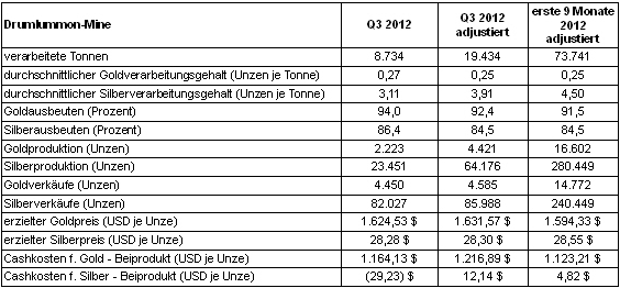 Die Silberproduktion des Galena-Komplexes erreichte in dem Quartal 544.104 Unzen und in den ersten neun Monaten des Jahres 2012 1,62 Mio. Unzen. Die Produktion von Drumlummon betrug seit dem 13. August 2012 2.223 Unzen Gold und 23.451 Unzen Silber. Die adjustierte Produktion von Drumlummon belief sich für das gesamte Quartal auf 4.421 Unzen Gold und 64.176 Unzen Silber und für die ersten neun Monate des Jahres 2012 auf zirca 16.600 Unzen Gold und 280.000 Unzen Silber.