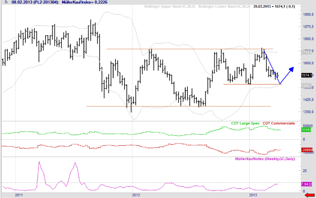 Zu Gold gibt es nicht wirklich etwas neues zu sagen. Die Commercials bauten ihre Shortkontrakte in die Konsolidierung wieder leicht von -162.364 auf -158.473 Kontrakte ab. Der Trend sollte weiter in Richtung obere Kanalbegrenzung laufen, siehe blauer Pfeil. Der Müllerindex liegt bei ca. 9 und bestätigt diese Vermutung.