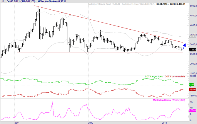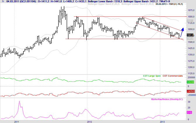 Die Commercials bauten ihre Shortkontrakte im Shake-Out dieser Woche von -158.473 auf -142.522 Kontrakte ab. Der Müllerindex stieg weiter auf 11,6 (einen Wert der zuvor am 11.5.2012 erreicht wurde, als Gold ebenfalls bei 1580 stand und in der Folge auf 1800 stieg).