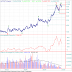 Interessant und anschaulich in diesem Beispiel ist die grosse negative Divergenz zum Momentum zum Zeitpunkt des B-Wellen-Hochs sowie das ständig abnehmende Volumen in der Endphase der Hausse.