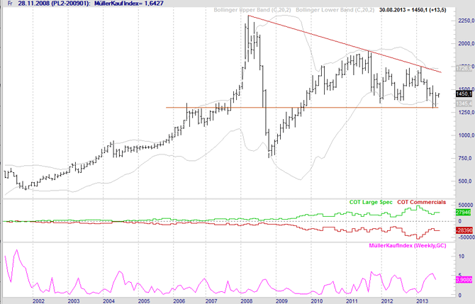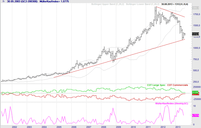 Im Monatschart von Gold (1 Kerze = 1 Monat) ist gut zu erkennen, dass die Commercials nach wie vor mit aktuell -25.774 Shortkontrakten extrem bullisch sind. Der Preis konnte sich von einem Tief unter 1.200 Dollar bereits wieder über 1.300 Dollar erholen. Diese Erholung wird weiterhin anhalten.