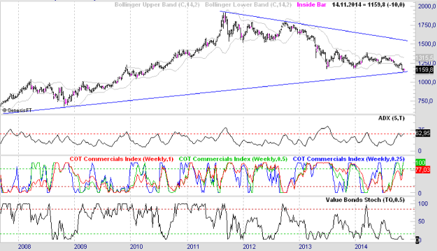 Gold durchbrach nun auch die bisherige Unterstützung bei 1180 US$. Der hohe ADX > 60 zeigt jedoch an, dass die Abwärtsbewegung bald zu Ende sein sollte. Die CoT-Daten sind positiv (im Graph "COT Index"), wie auch der Vergleich mit den Bonds (im Graph "Value Bonds Stoch"). Vielleicht geht es noch weiter auf die GoldmanSachs Marke von 1050: a) dass die sagen können sie hätten recht und/oder b) dass die Schweizer am Monatsende "richtig" abstimmen.