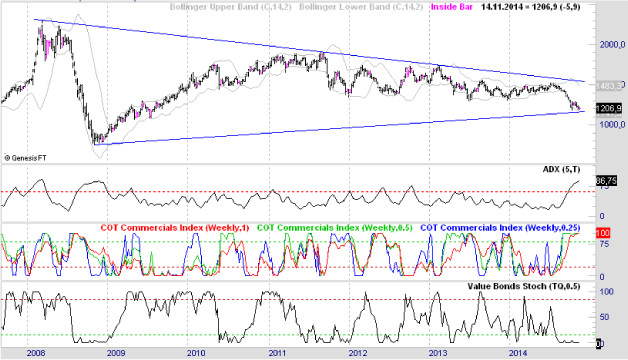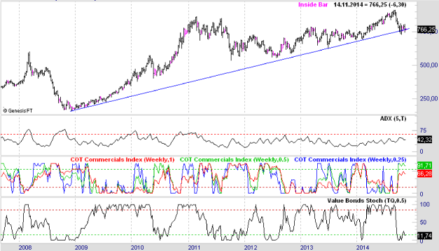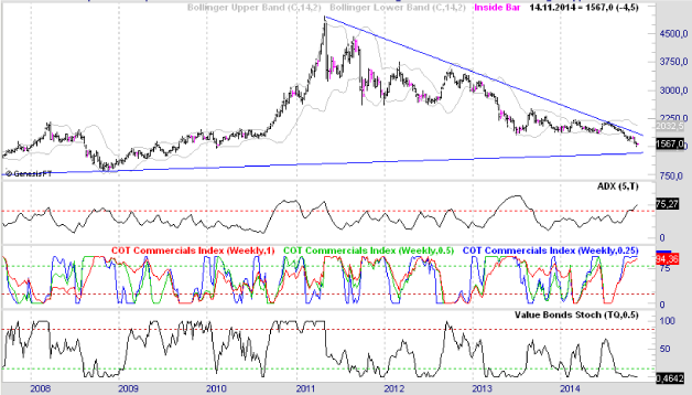 Exakt das gleiche Bild für Silber. Ein ADX-Wert von < 75 hat in der Vergangenheit immer sehr zuverlässig das Ende einer Bewegung angezeigt (nach oben oder unten, der ADX unterscheided dies nicht). Da die CoT-Daten positiv sind, sollte der Kurs wieder nach oben gehen und im neuen Jahr die Widerstandslinie durchbrechen, d.h. das Dreieck nach oben hin auflösen. Die aktuellen Daten indizieren ein Kaufumfeld, kein Verkaufumfeld.