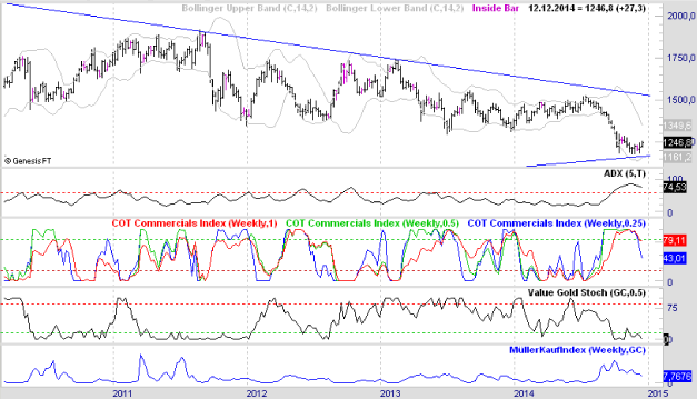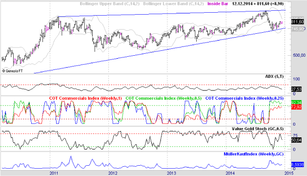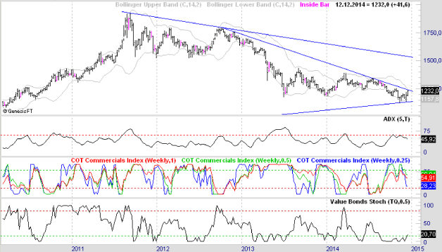 Im letzten Bericht schrieb ich: "Da die CoT-Daten positiv sind, sollte der Kurs wieder nach oben gehen und im neuen Jahr die Widerstandslinie durchbrechen, d.h. das Dreieck nach oben hin auflösen." Der Kurs konnte sich seit dem schon wieder erholen und marschiert Richtung langjähriger Widerstandslinie.