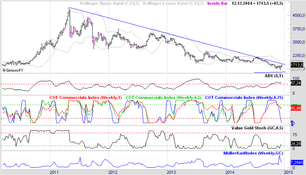 Im letzten CoT-Bericht schrieb ich: "Der hohe ADX > 60 zeigt jedoch an, dass die Abwärtsbewegung bald zu Ende sein sollte". Der Kurs hat in der Tat gedreht und ist gestern bis an die Widerstandslinie gestiegen, die sich seit Herbst 2012 ausgebildet hat. Eigentlich sollte der Kurs diese Linie nun auch überwinden.