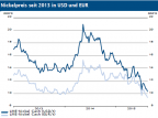 Analog zum gesamten Industriemetallsektor hat auch der Nickelpreis seine Abwärtsbewegung weiter fortgesetzt. Zwar gab es auf der Angebotsseite zuletzt Entwicklungen, die für eine Stabilisierung der Preise sprechen. Auch sind die Lagerbestände seit Anfang Juni rückläufig. Insgesamt überwiegen am Markt jedoch die Befürchtungen eines deutlich geringeren Nachfragewachstums. Dabei bereiten insbesondere die schwächeren Konjunkturindikatoren Chinas Sorgen, ist doch das Reich der Mitte der größte Verbraucher des Legierungsmetalls. LME-Nickel notiert gegenwärtig 31% niedriger als zu Jahresbeginn (LME-Index -19%). Der Durchschnittskurs für den bisherigen Jahresverlauf liegt bei 13.134 USD/t.