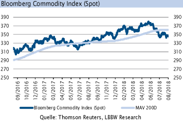 Performance und IndizesDie Preise an den Rohstoffmärkten haben sich von ihrem Jahrestief bei 342 Punkten im Bloomberg Commodity Index (Spot), das Mitte August erreicht wurde, zuletzt etwas erholt. Rückenwind kam vor allem vom wieder etwas schwächeren US-Dollar. Als Damoklesschwert schwebt jedoch weiter der Handelsstreit zwischen den USA und China über dem Markt. Der Konflikt hat mittlerweile eine neue Eskalationsstufe erreicht.