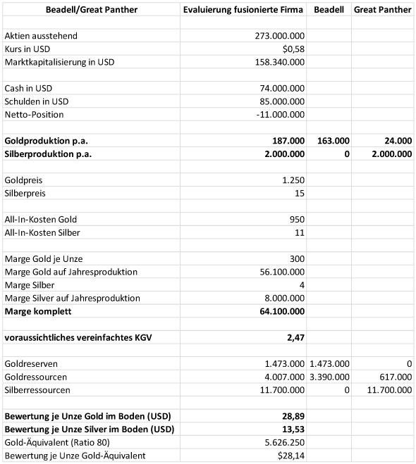 Um nochmals einen genaueren Blick auf die anstehende Fusion von Beadell Resources Ltd. und Great Panther Silver Ltd. zu bekommen, nachfolgend die Bewertung der fusionierten Firma auf einen Blick: