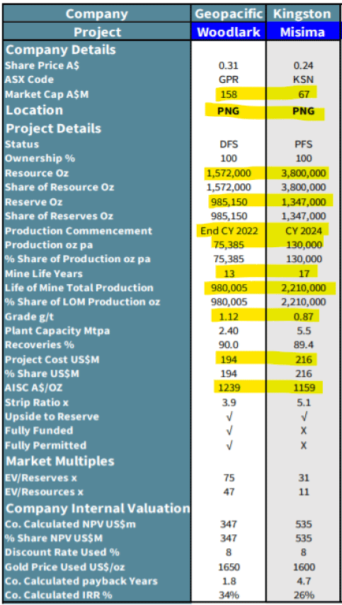 Aufgrund der Lage des Projektes in Papua-Neuguinea haben die Analysten das Projekt von Kingston mit dem von Geopacific verglichen, welches ebenfalls dort liegt und derzeit gebaut wird: