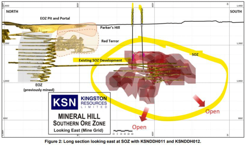 Die SOZ wird über einen bestehenden Tunnel aus der früheren Mine erreicht und von der Oberfläche aus konnte Kingston Resources im vergangenen Jahr die oberen Zonen anbohren. Man traf auf gute Mineralisierungen (siehe unten im Bild):