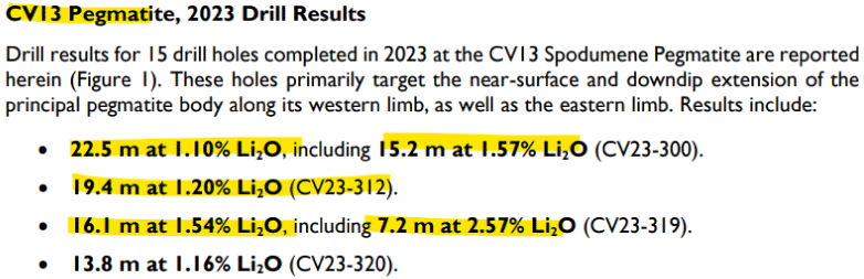Patriot Battery Metals heute vor Börseneröffnung in Sydney (ASX: PMT) mit weiteren Bohrergebnissen von Corvette-Projekt in Quebec und weiteren Infos zu den aktuellen und geplanten Arbeiten: Link.Solide Resultate von CV13 mit Lithium-Gehalten von bis zu 2,57% über 7,2 Metern und gut mineralisierten Strecken mit >1,10% Lithium: